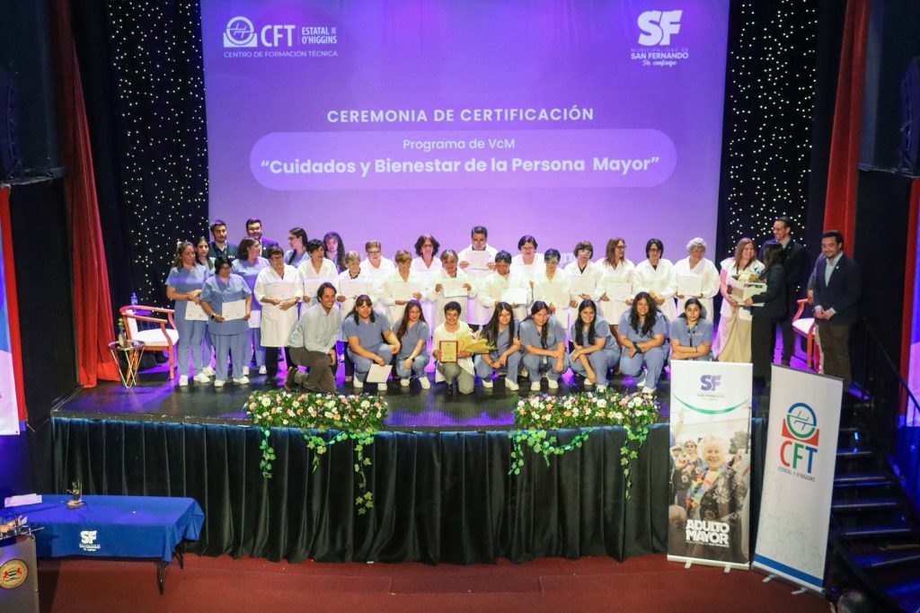 Con un Teatro Municipal lleno, se dio cierre a un importante Proyecto de vinculación con el Medio, desarrollado en conjunto con la Oficina del Adulto Mayor de la Municipalidad de San Fernando. En la ocasión, 15 participantes fueron certificados como cuidadores y cuidadoras de personas mayores, tras semanas de capacitación, dedicación y trabajo colaborativo, donde docentes y alumnos de nuestra Institución Sede San Fernando, capacitaron a cada uno de los cuidadores y cuidadoras.