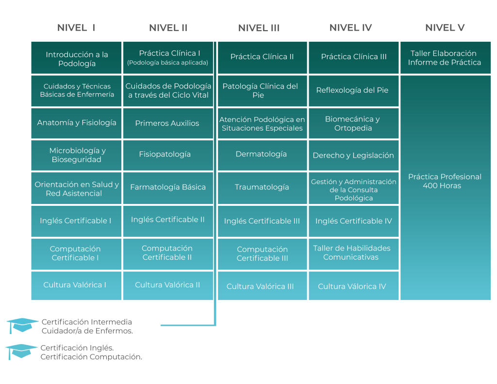 - Desarrollar labores de promoción, prevención, tratamiento, recuperación y rehabilitación del pie humano, mediante acciones no invasivas que privilegien la salud podal en todo el ciclo vital.